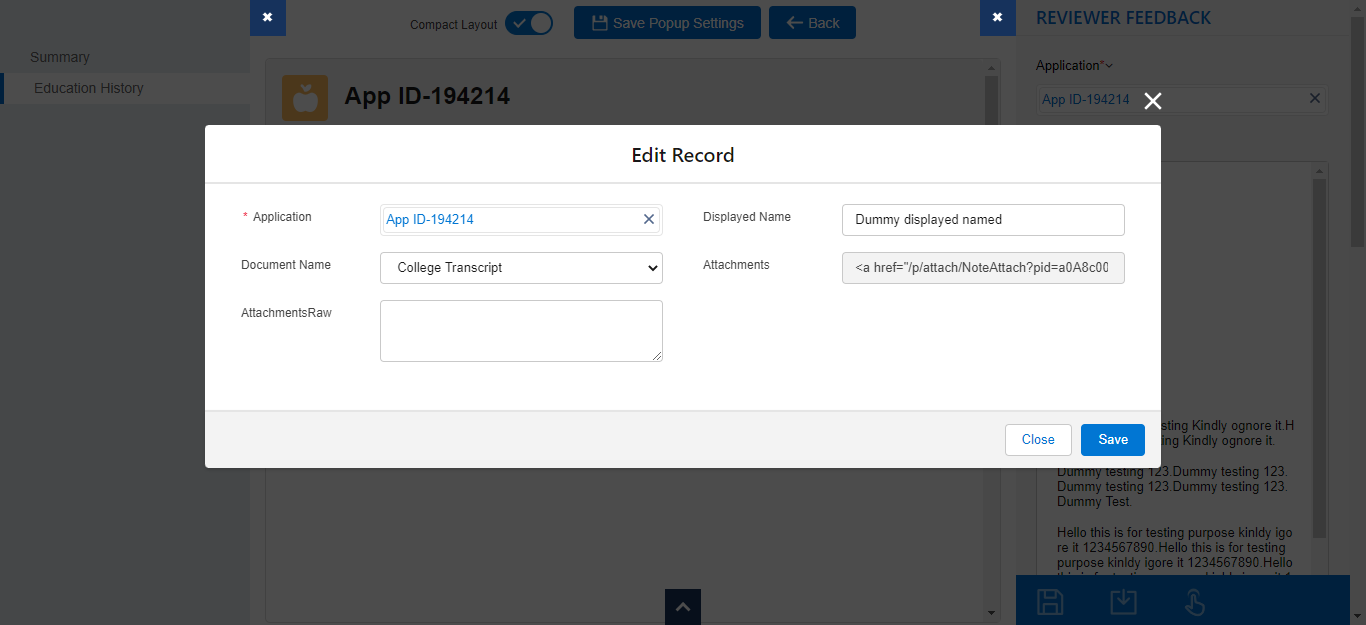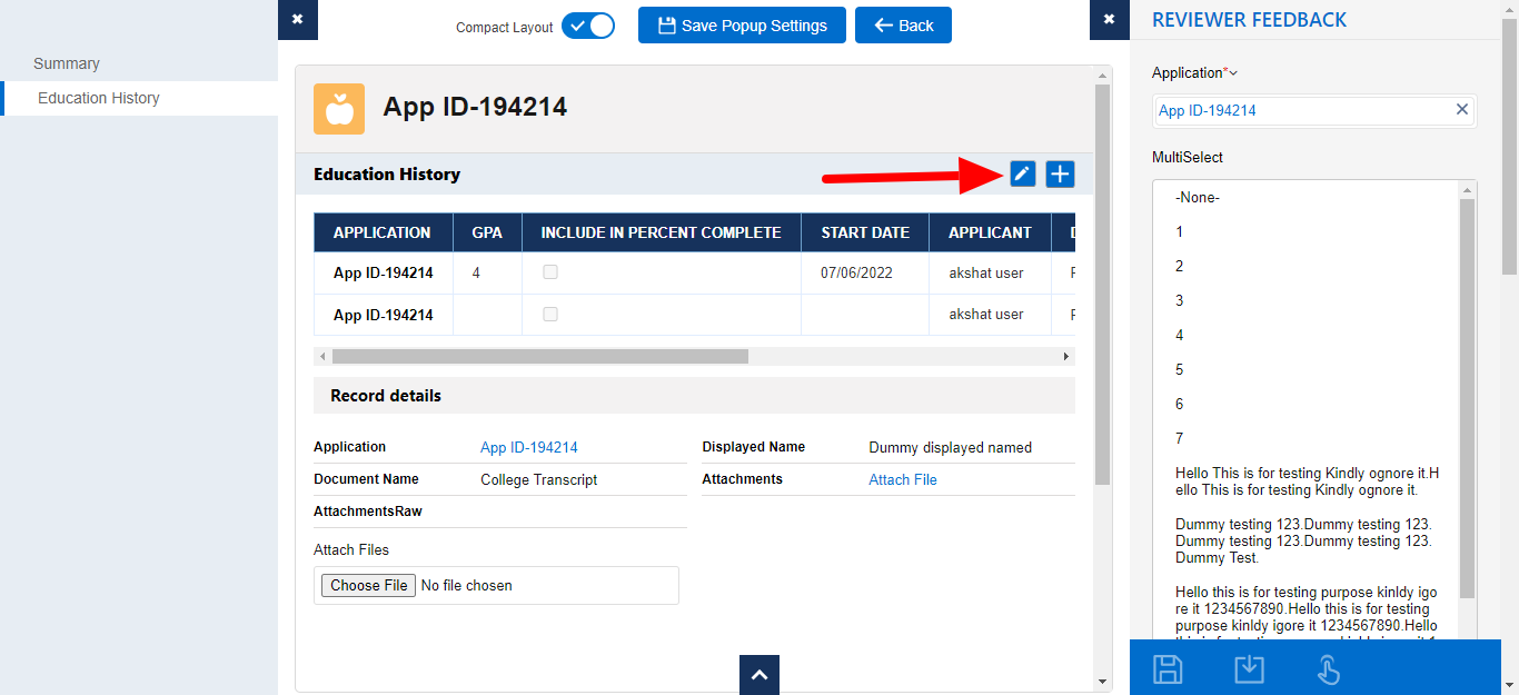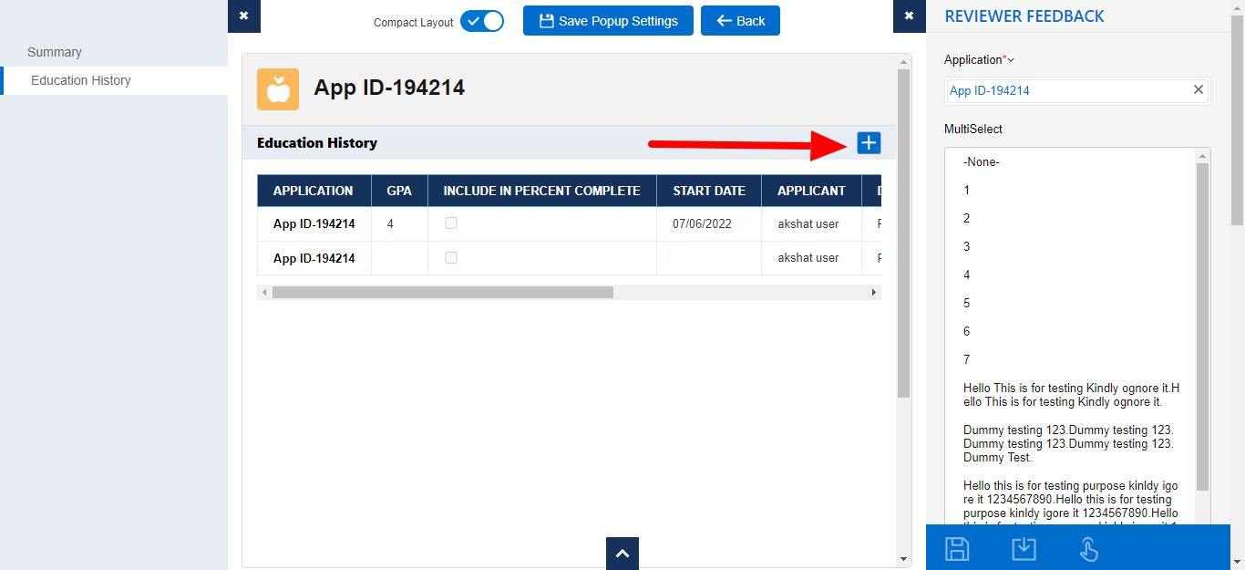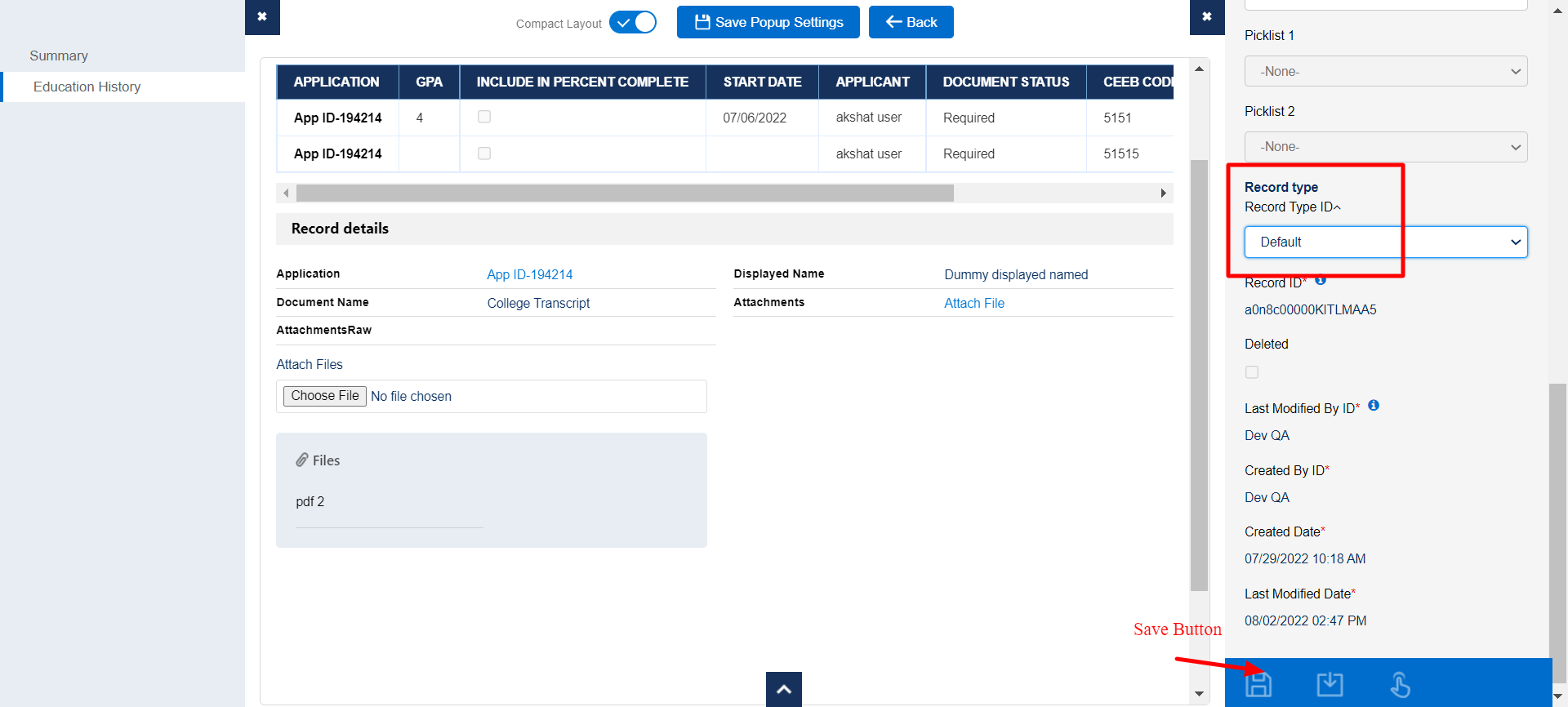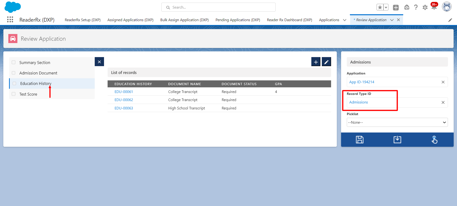 After clicking the Save button, a record is created in the Summary Section for the Education History object.