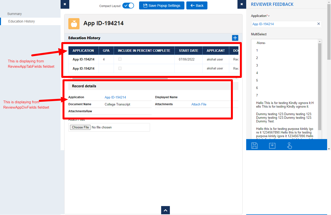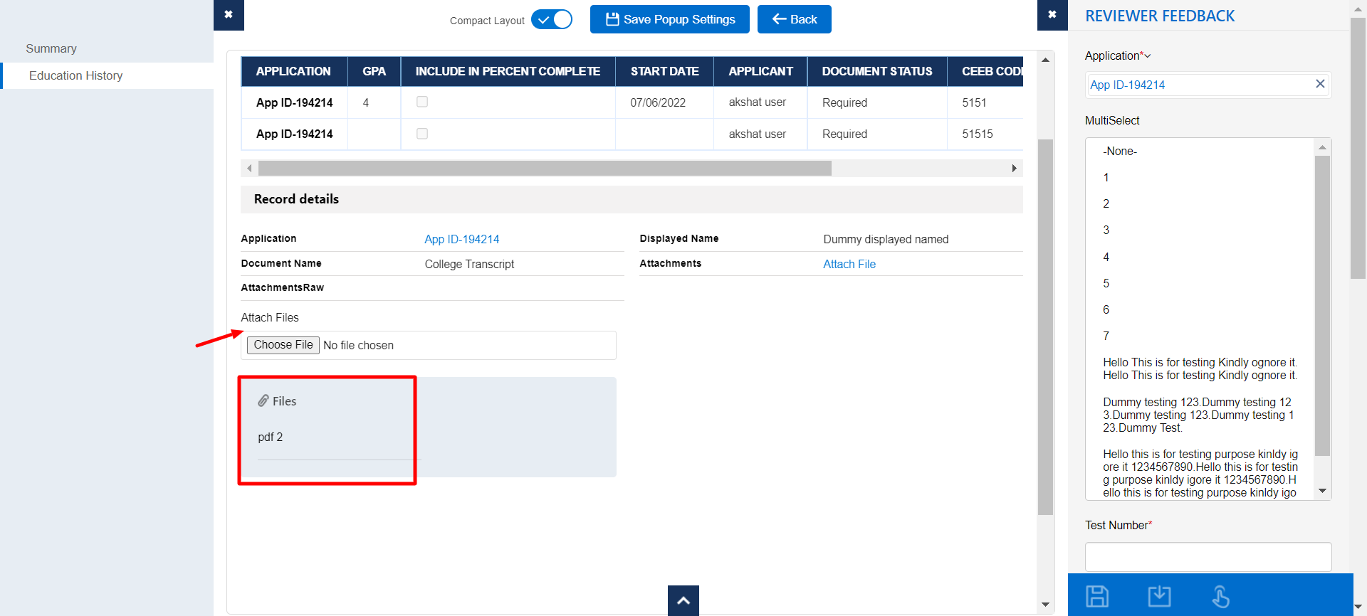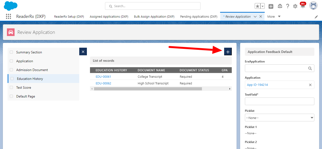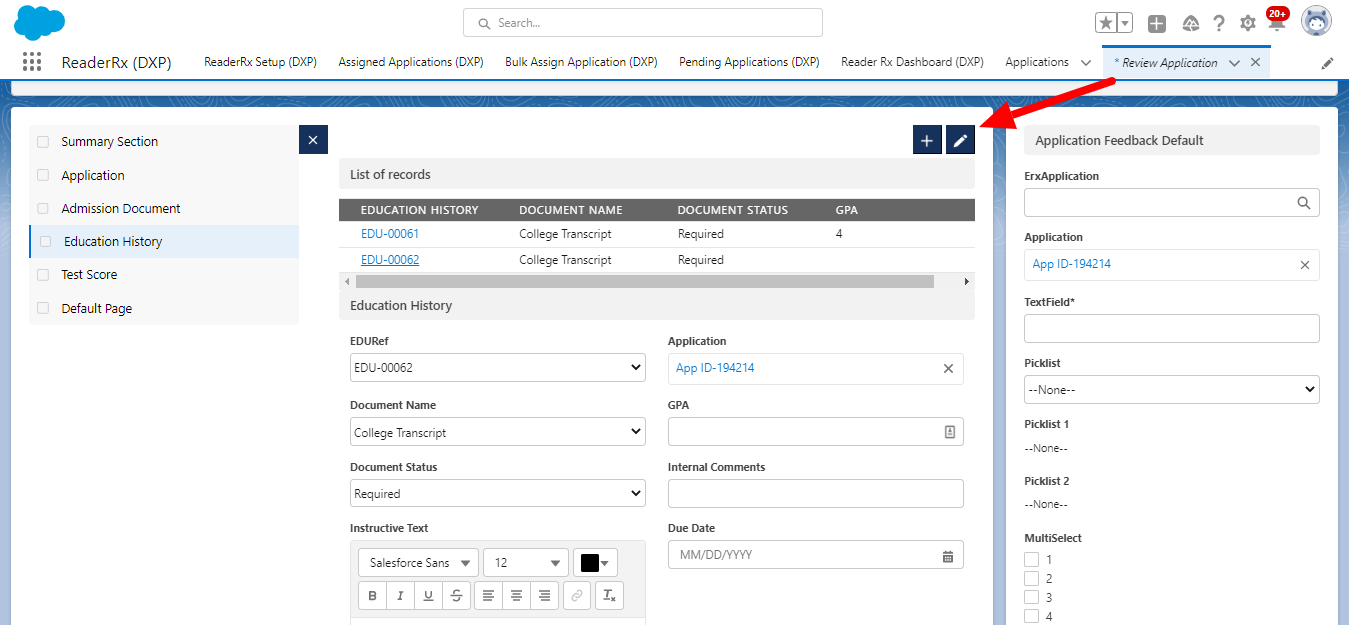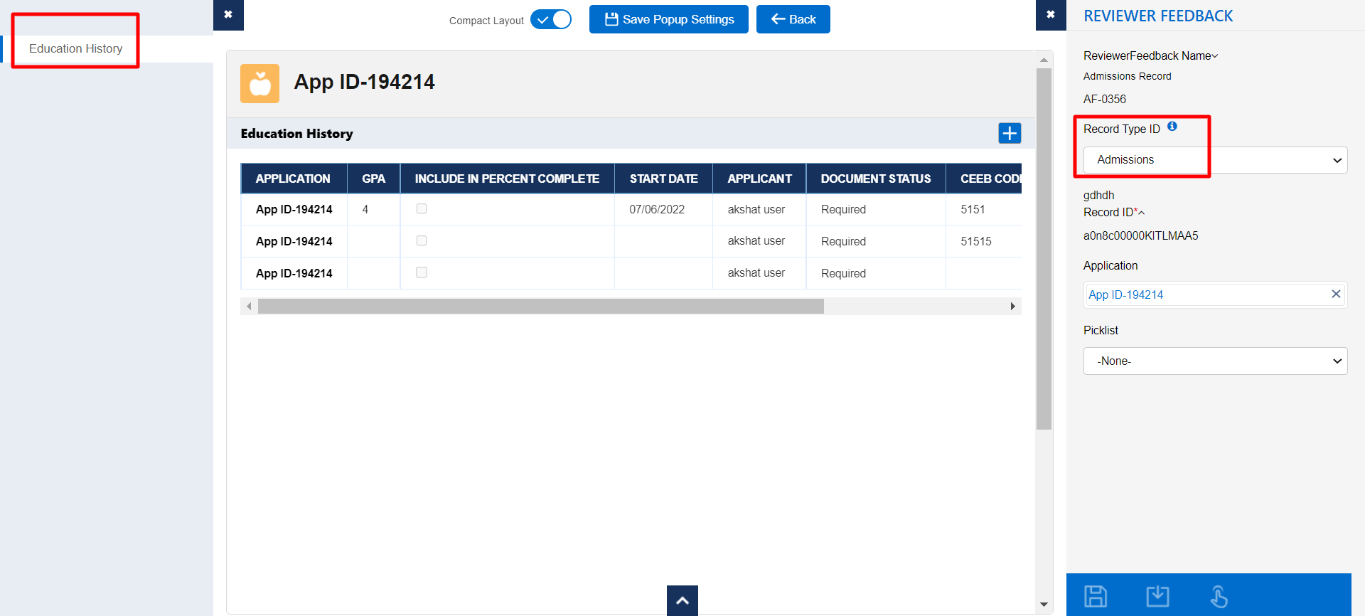 After clicking the Save button, a record is created in the Summary Section for the Education History object.
