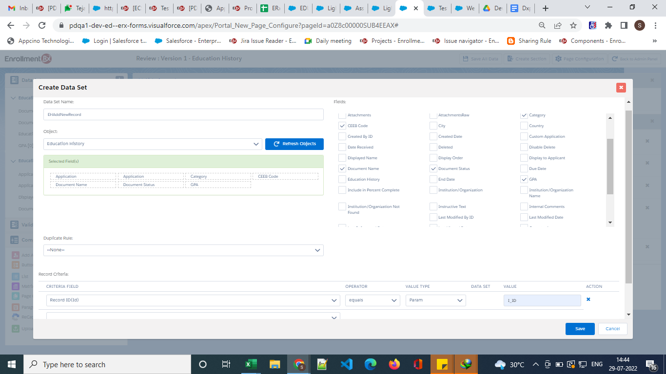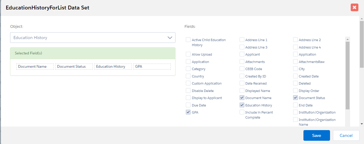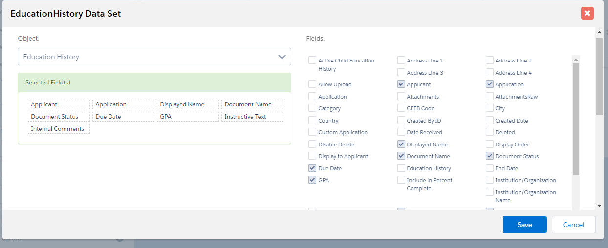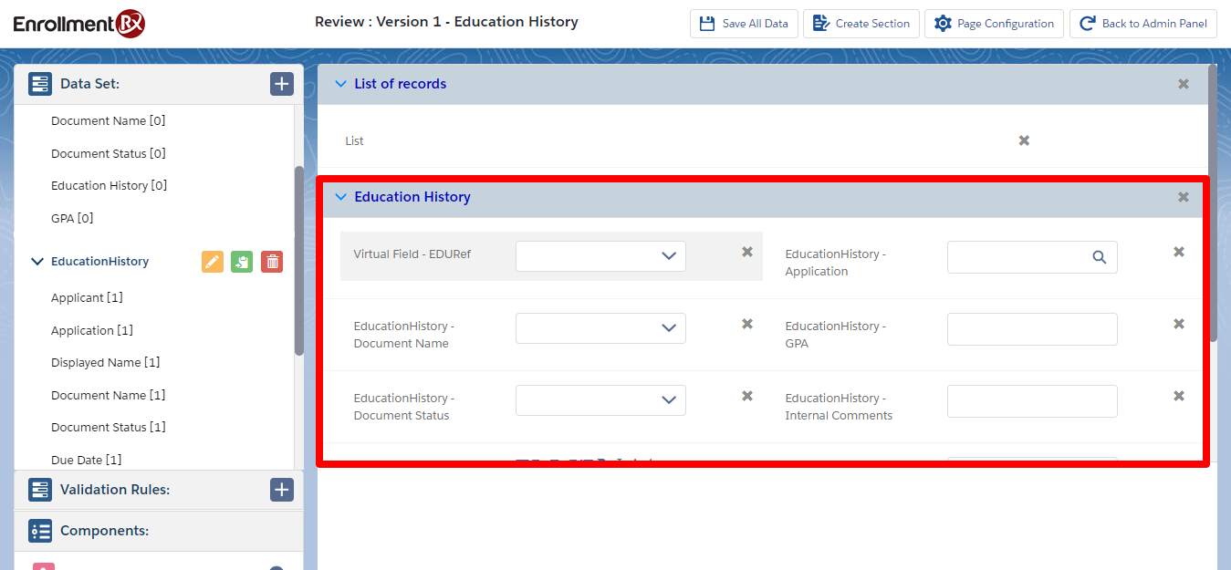 - Data Set creation & configuration: After creating a page, create two Data Sets on your object (e.g., Education History)