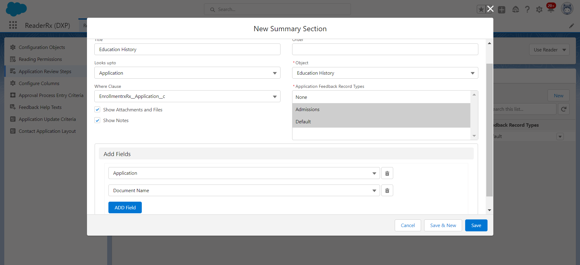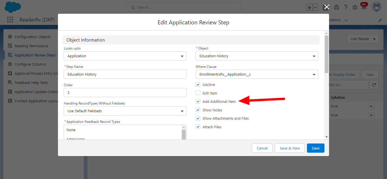 To enable the Add New Record feature for the Review Screen, click the “Add additional item” checkbox permission from the Application Review Step record.