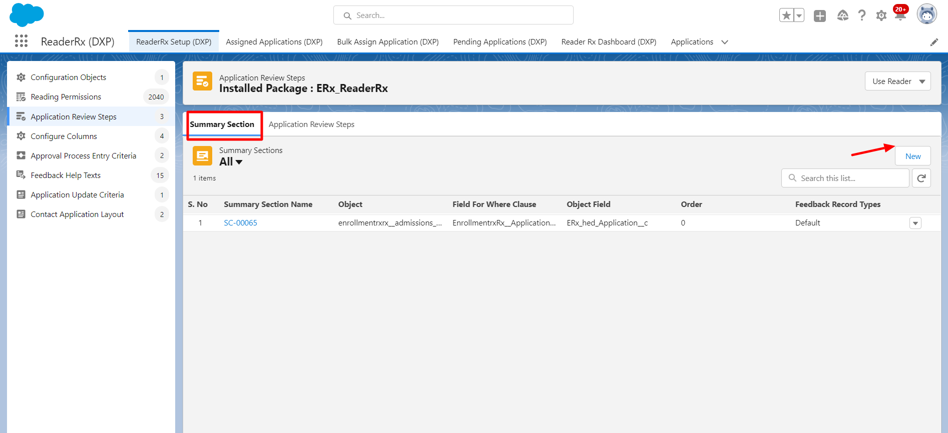 In Reader Rx, to create the Summary Section, you navigate to the Summary Section tab and click the New button.