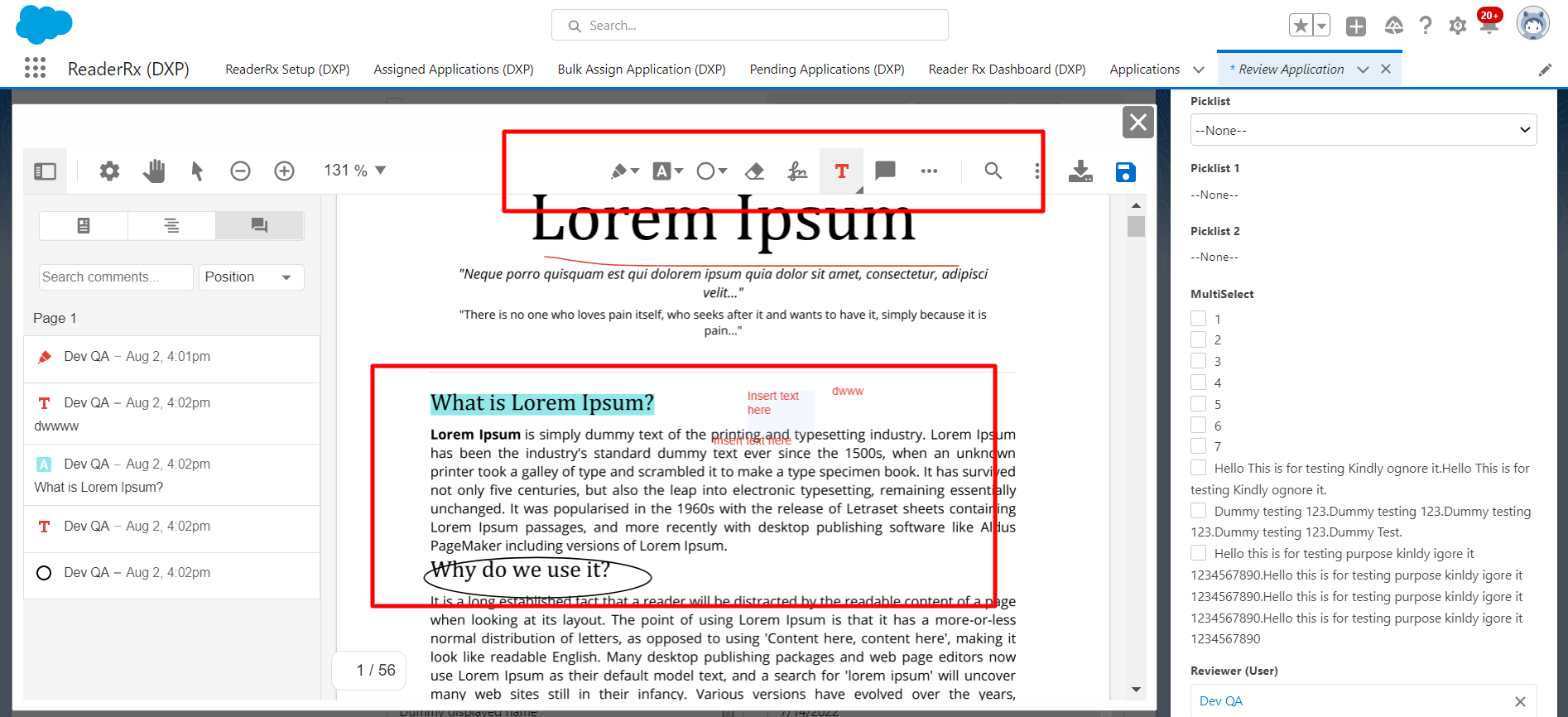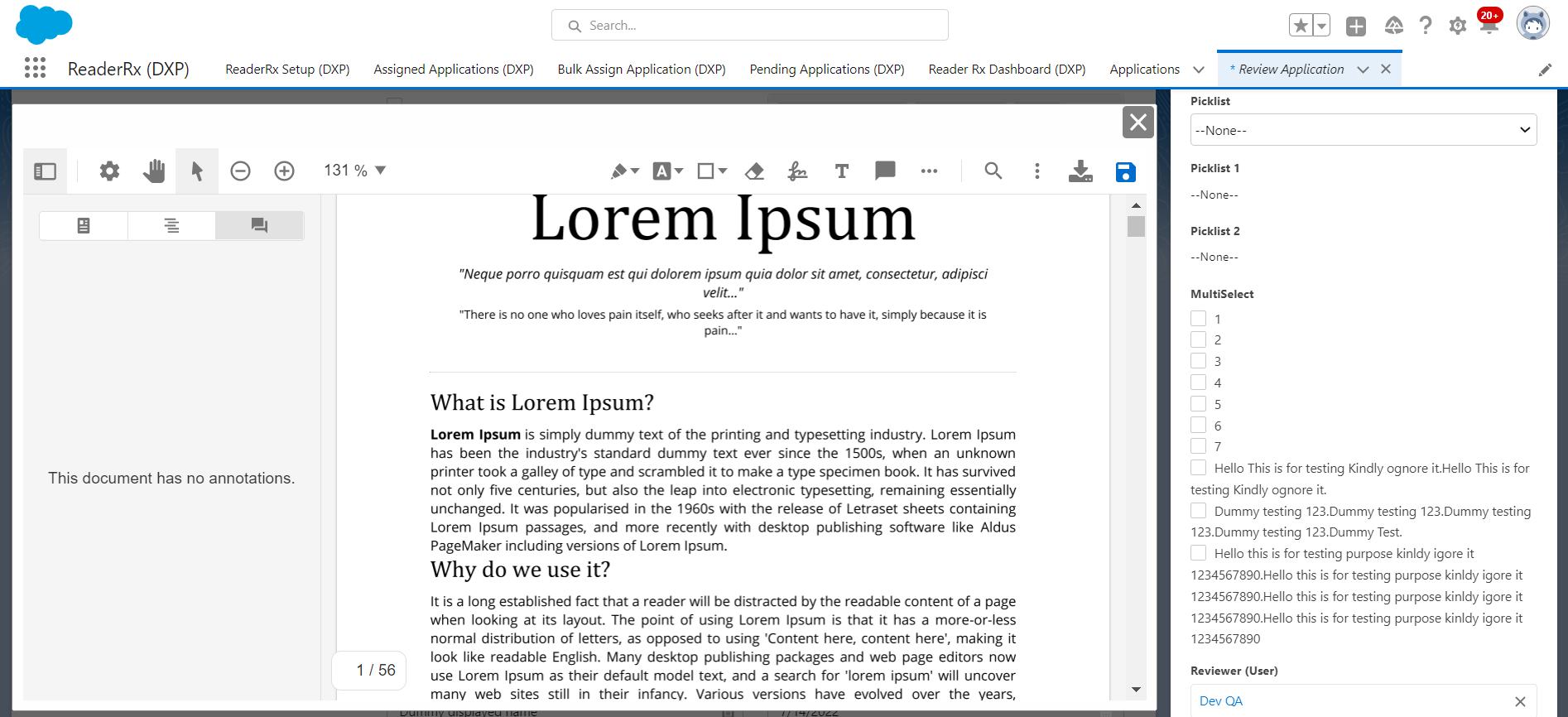 To annotate documents, use the PDFTron feature on the Review Screen. To enable the PDFTron license, click on “Refresh License” button from “Configuration Object” component on Reader Rx Setup tab.