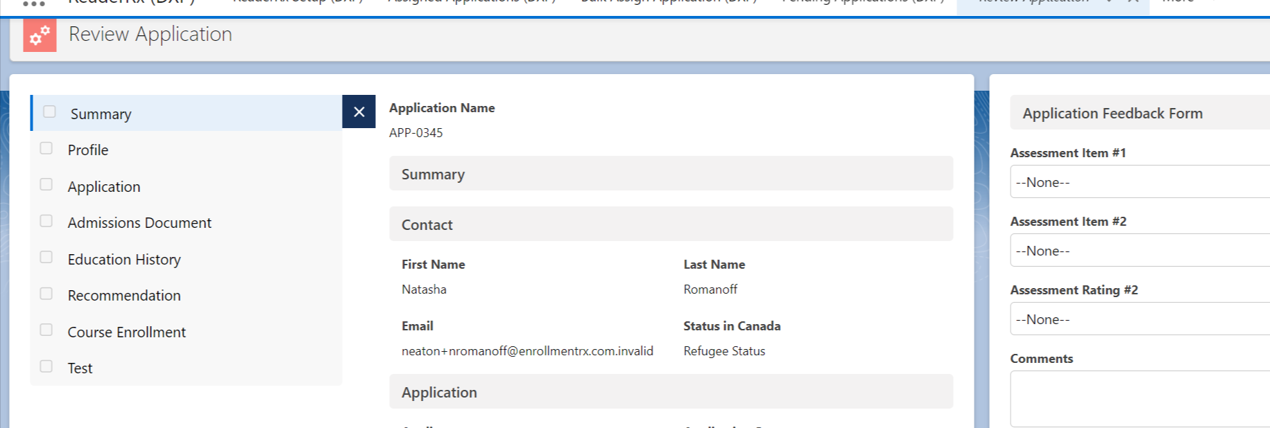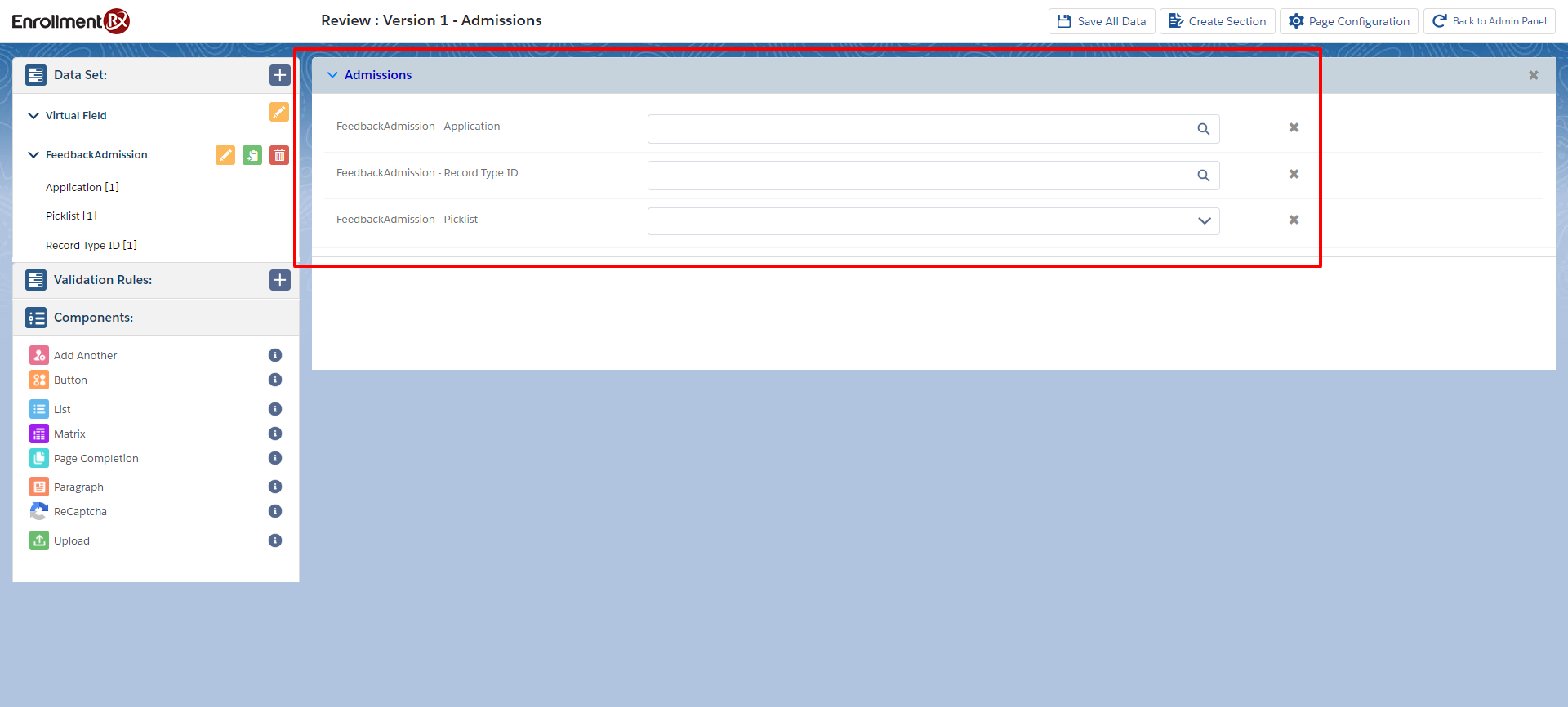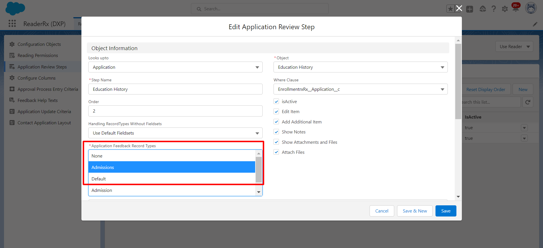 Navigate to the review screen and change the feedback record type from "Default" to "Admissions" and click the Save button.