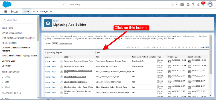 - In the Quick Find box, type "Lightning App Builder" and click on it when it appears in the search list