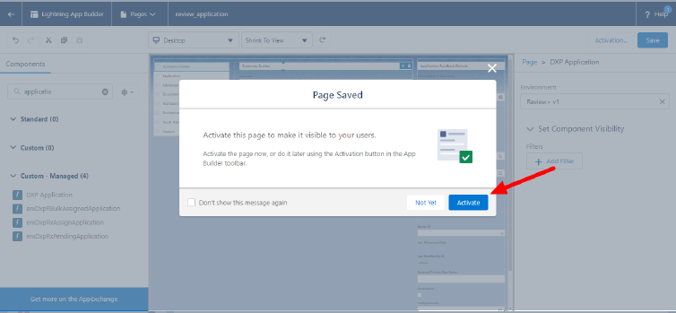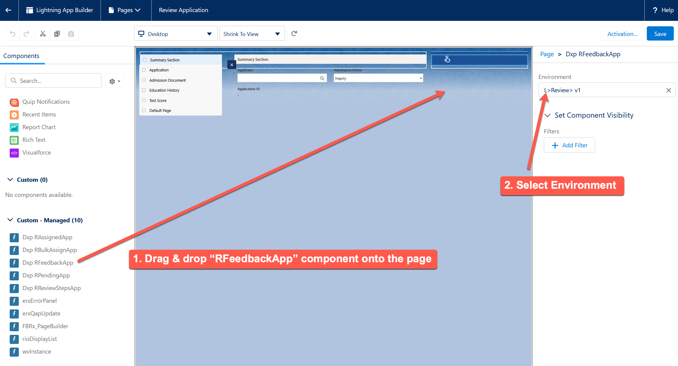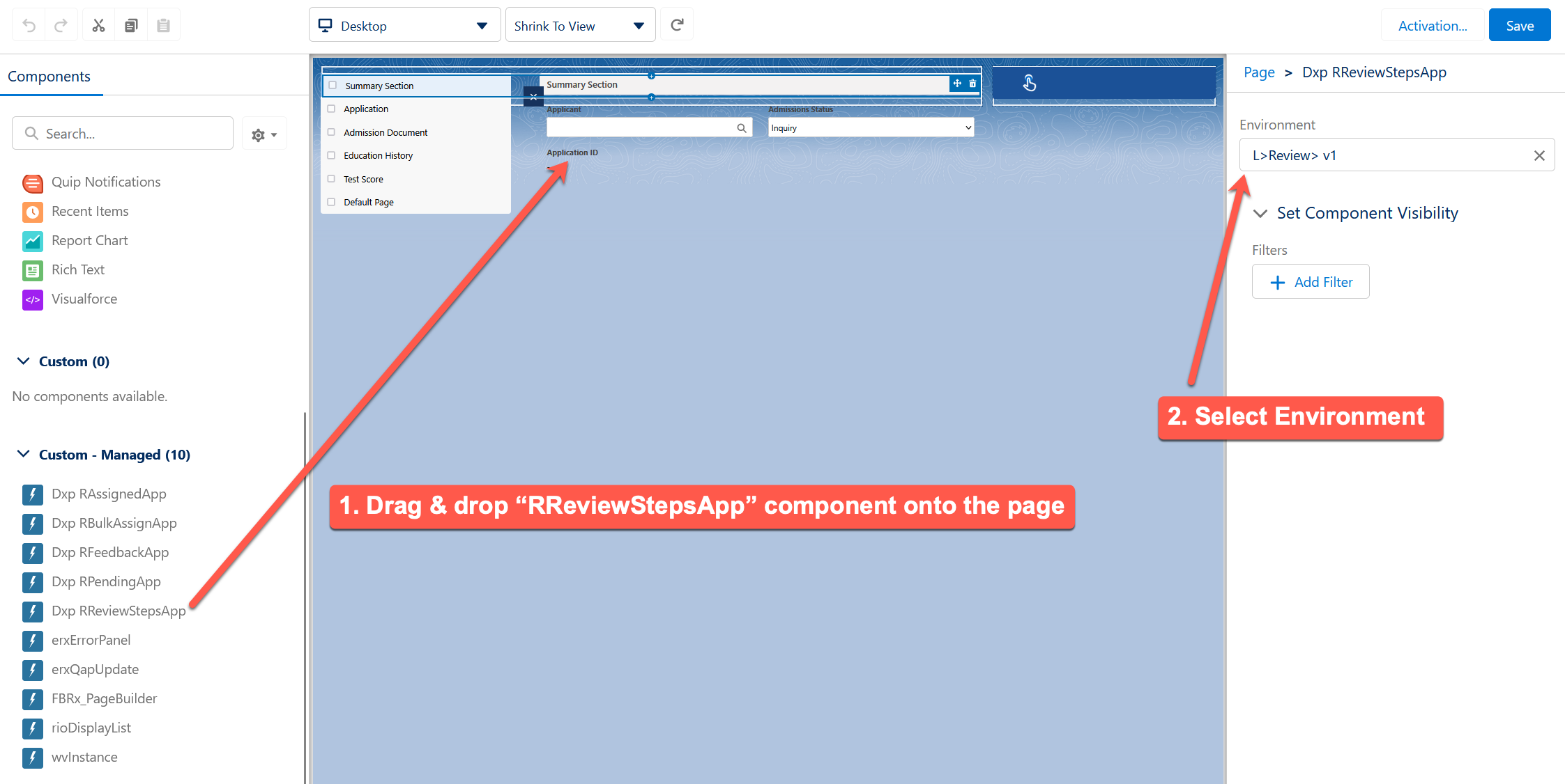- Drop the "DXP RReviewStepsApp" component on the page and select the environment