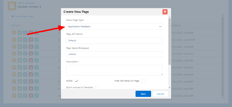 - In the popup window, select the Page Type as "Application Feedback" and create it