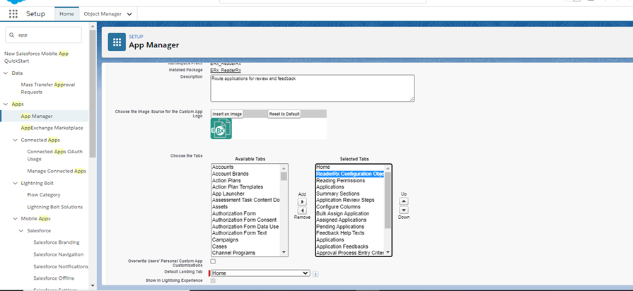 In the past, if you clicked on the ReaderRx Configuration Object tab then you also needed to click on the Edit button of the Default record. The following steps will make the Configuration Object Visualforce page open with a single click: