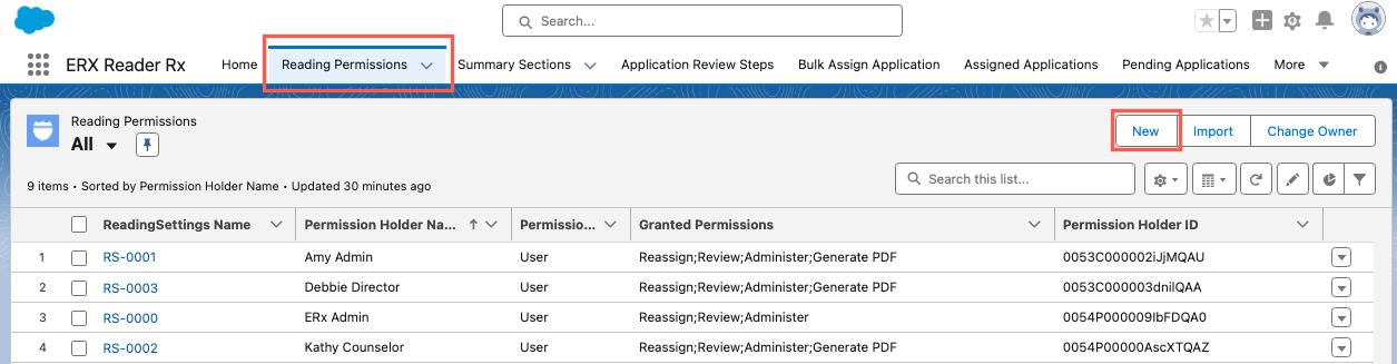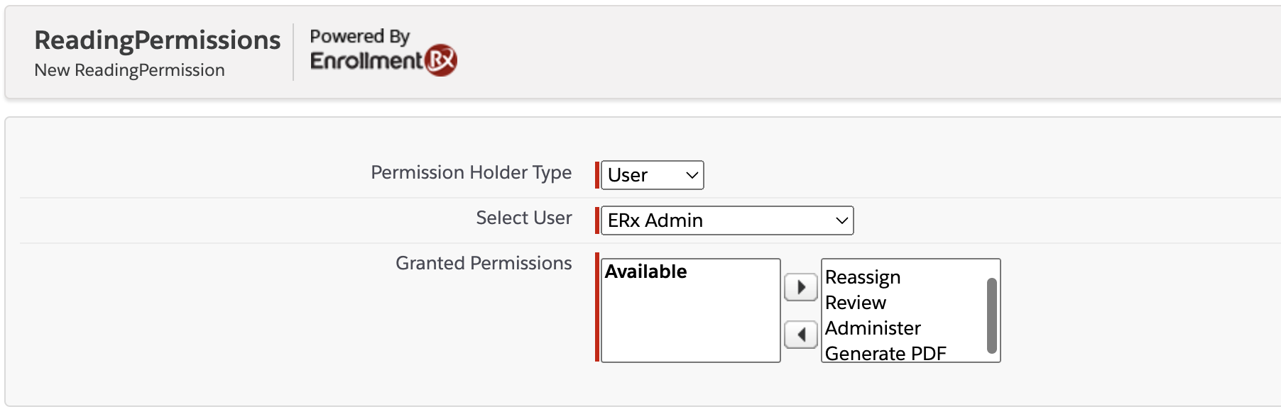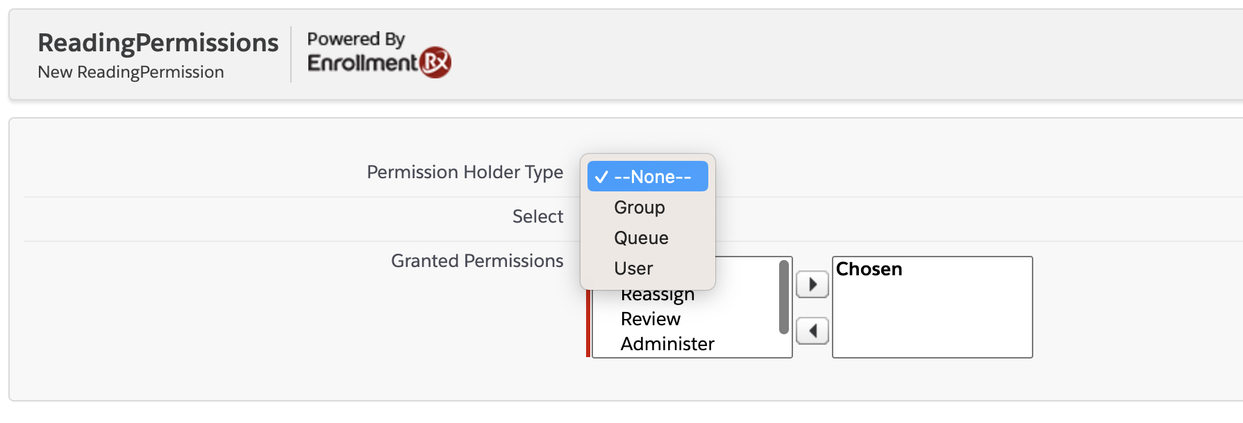 ERx_ReaderRx__ReadingPermission__c). How to Assign Permissions to a User or Queue